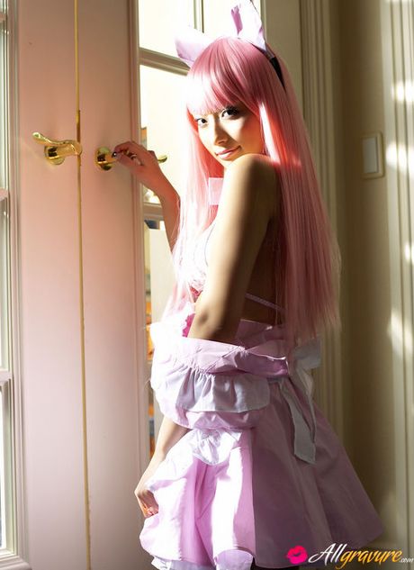 All Gravure: Sexy gravure idol babe naked in a cute pink wig and maid costume